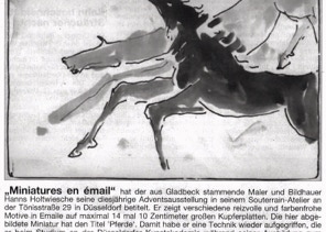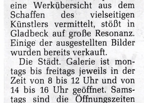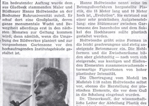 Hier gibt es eine Übersicht des künstlerischen Schaffens von Hanns Holtwiesche, gegliedert in Alben zu den Bereichen Plastik, Gemälde, Aquarelle und Sakralbau sowie eine Pressemappe mit gesammelten Zeitungsartikeln. Ein Doppelklick auf eines der Alben öffnet die jeweilige Bildergalerie. Eine fachkundige „Führung“ durch das Werk von Hanns Holtwiesche gegeben durch Prof. Dr. Christian Theuerkauff, finden Sie hier: Zur Führung